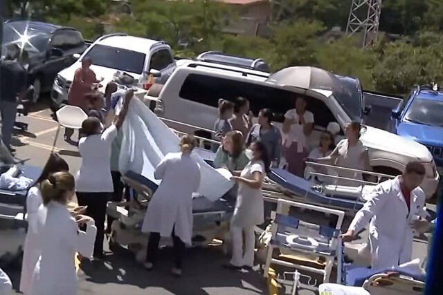 Pacientes em macas, cadeiras de rodas e vestindo roupas hospitalares foram levados para o lado extrínseco da unidade de saúde.