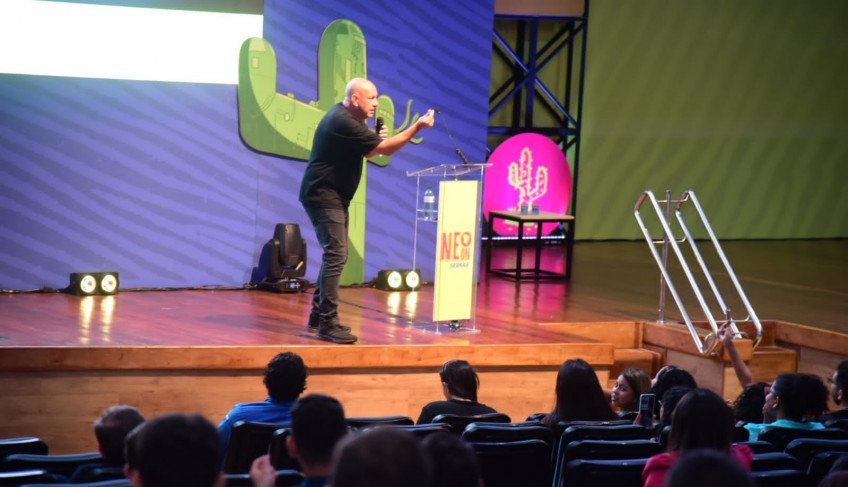 Não se adia a transformação do dedo. Isso é vestimenta! O professor, pesquisador e repórter Oferecido Schneider, através de sua performance inovadora e didática, prendeu a atenção do público presente no auditório Darcy Ribeiro, do Meio de Convenções Multicenter Sebrae, até o último momento da palestra “O Mundo muda, a palestra muda”, encerrando a programação dessa quinta-feira (1), no Nordeste ON – NEon.